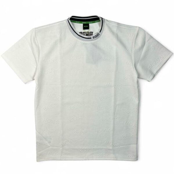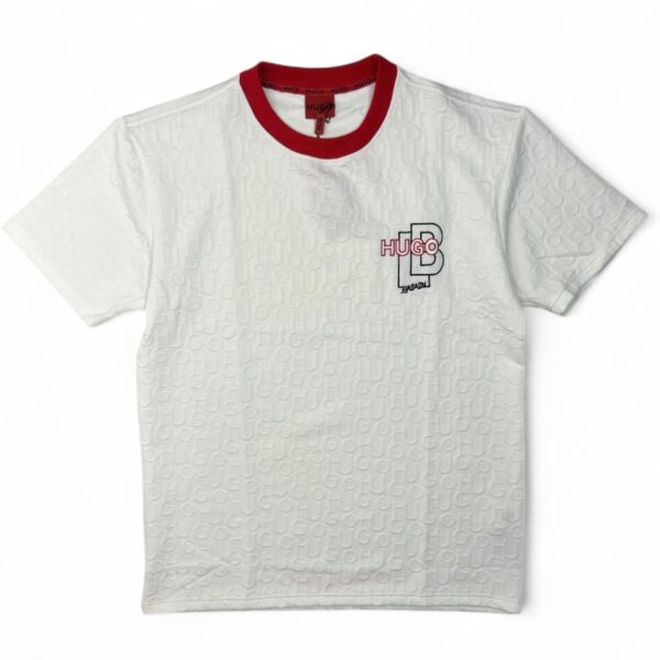• Textura: La tela de las camisetas tiene una textura en relieve, posiblemente un patrón de jacquard o similar, que añade un detalle visual sutil.