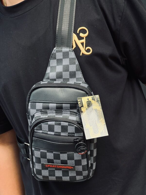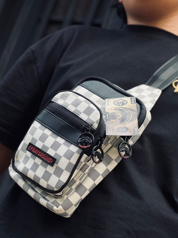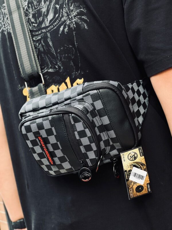 • Diseño distintivo: Presenta un patrón a cuadros (similar al damero) y el icónico diseño de boca de tiburón de Sprayground, a menudo con detalles como «ONE MILLION».